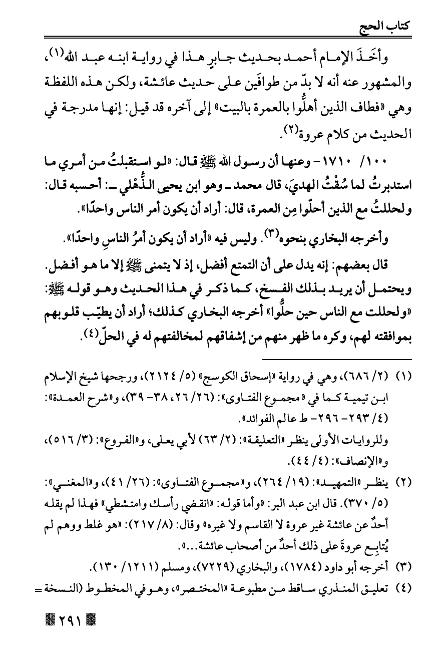 ١٠٠/ ١٧١٠ - وعنها أن رسول الله - صلى الله عليه وسلم - قال: «لو استقبلتُ من أمري ما استدبرتُ لما سُقْتُ الهديَ، قال محمد ــ وهو ابن يحيى الذُّهْلي ــ: أحسبه قال: ولحللتُ مع الذين أحلّوا مِن العمرة، قال: أراد أن يكون أمر الناس واحدًا».