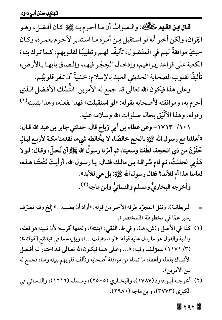 قال ابن القيم - رحمه الله -: والصوابُ أن ما أحرم به - صلى الله عليه وسلم -,كان أفضل, وهو القِران, ولكن أخبر أنه لو استقبل مِن أمره ما استدبر لأحرم بعمرة, وكان حينئذٍ موافقةً لهم في المفضول, تأليفًا لهم وتطييبًا لقلوبهم, كما ترك بناءَ الكعبة على قواعد إبراهيم, وإدخال الحِجْر فيها, وإلصاق بابها بالأرض, تأليفًا لقلوب الصحابة الحديثي العهد بالإسلام, خشيةً أن تنفر قلوبُهم.