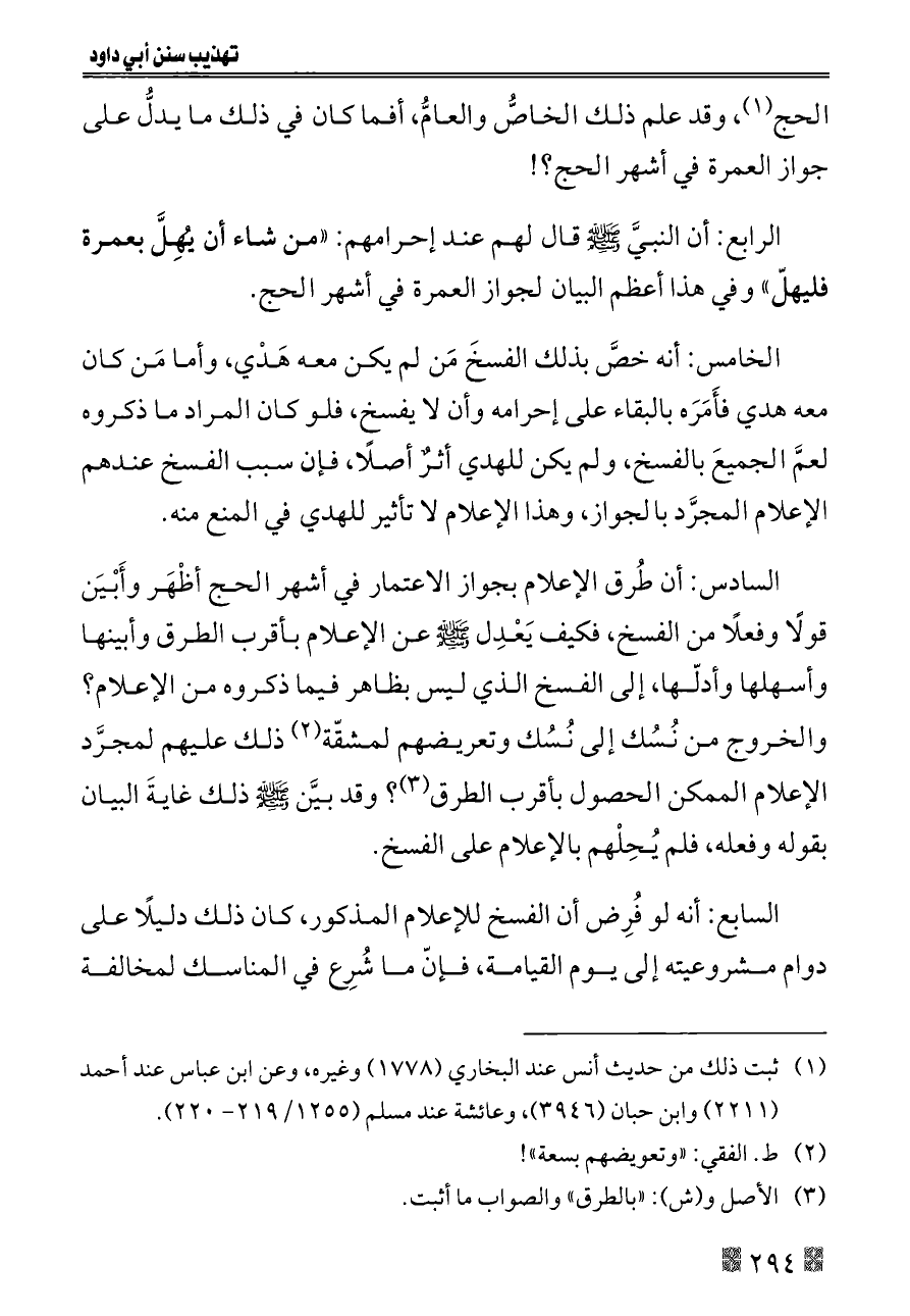 السابع: أنه لو فُرِض أن الفسخ للإعلام المذكور, كان ذلك دليلًا على دوام مشروعيته إلى يوم القيامة, فإنّ ما شُرِع في المناسك لمخالفة