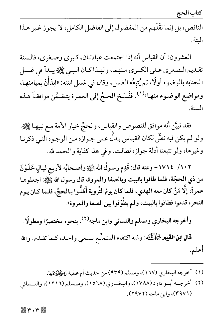 العشرون: أن القياس أنه إذا اجتمعت عبادتان, كبرى وصغرى، فالسنة تقديم الصغرى على الكبرى منهما, ولهذا كان النبي - صلى الله عليه وسلم - يبدأ في غسل الجنابة بالوضوء أولًا, ثم يُتبِعُه الغسل, وقال في غسل ابنته: «ابدَأْنَ بميامنها, ومواضع الوضوء منها» (¬١). ففَسْخ الحجِّ إلى العمرة يتضمَّن موافقةَ هذه السنة.