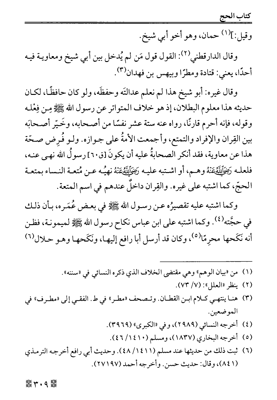 وقال غيره: أبو شيخ هذا لم نعلم عدالتَه وحفظَه, ولو كان حافظًا, لكان حديثه هذا معلوم البطلان, إذ هو خلاف المتواتر عن رسول الله - صلى الله عليه وسلم - مِن فِعْله وقوله, فإنه أحرم قارنًا, رواه عنه ستة عشر نفسًا من أصحابه, وخَيّر أصحابَه بين القِران والإفراد والتمتع, وأجمعت الأمةُ على جوازه. ولو فُرِض صحّة هذا عن معاوية, فقد أنكر الصحابةُ عليه أن يكونَ [ق ٦٠] رسولُ الله نهى عنه, فلعله - رضي الله عنه - وهم, أو اشتبه عليه - رضي الله عنه - نهيُه عن مُتعة النساء بمتعة الحجّ, كما اشتبه على غيره. والقِران داخلٌ عندهم في اسم المتعة.