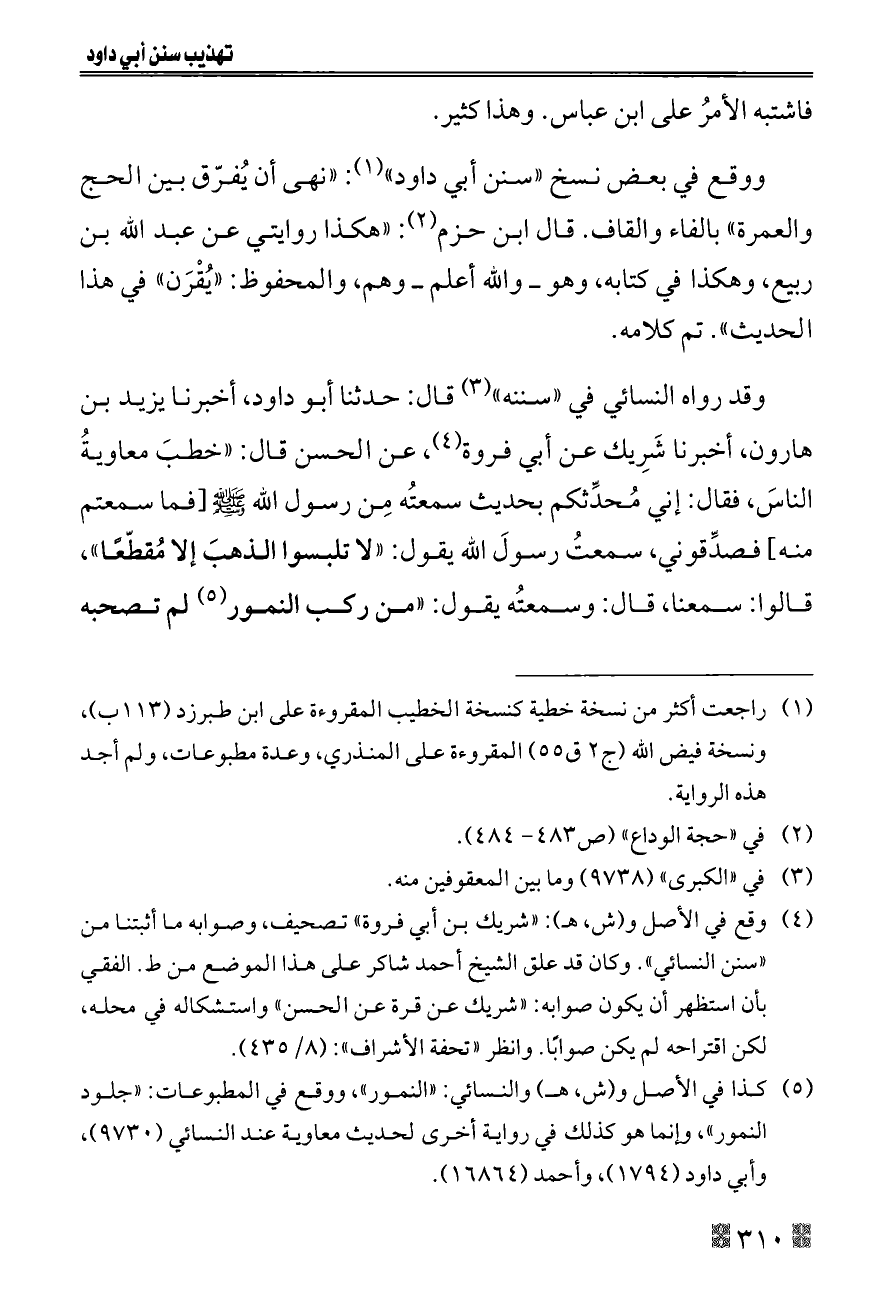 ووقع في بعض نسخ «سنن أبي داود» (¬١): «نهى أن يُفرّق بين الحج والعمرة» بالفاء والقاف. قال ابن حزم (¬٢): «هكذا روايتي عن عبد الله بن ربيع, وهكذا في كتابه, وهو ــ والله أعلم ــ وهم, والمحفوظ: «يُقْرَن» في هذا الحديث». تم كلامه.