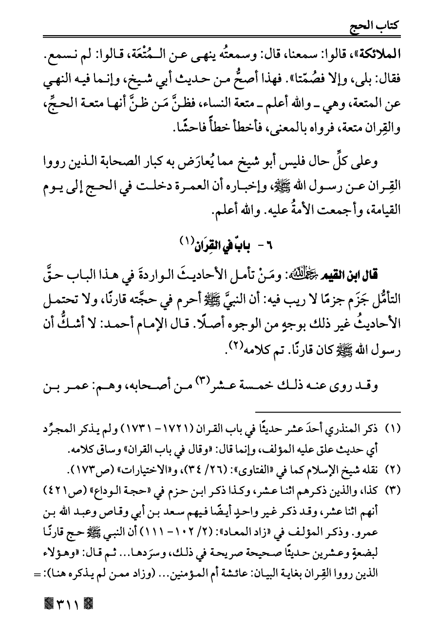 (¬١) ذكر المنذري أحدَ عشر حديثًا في باب القران (١٧٢١ - ١٧٣١) ولم يذكر المجرِّد أي حديث علق عليه المؤلف، وإنما قال: «وقال في باب القران» وساق كلامه.