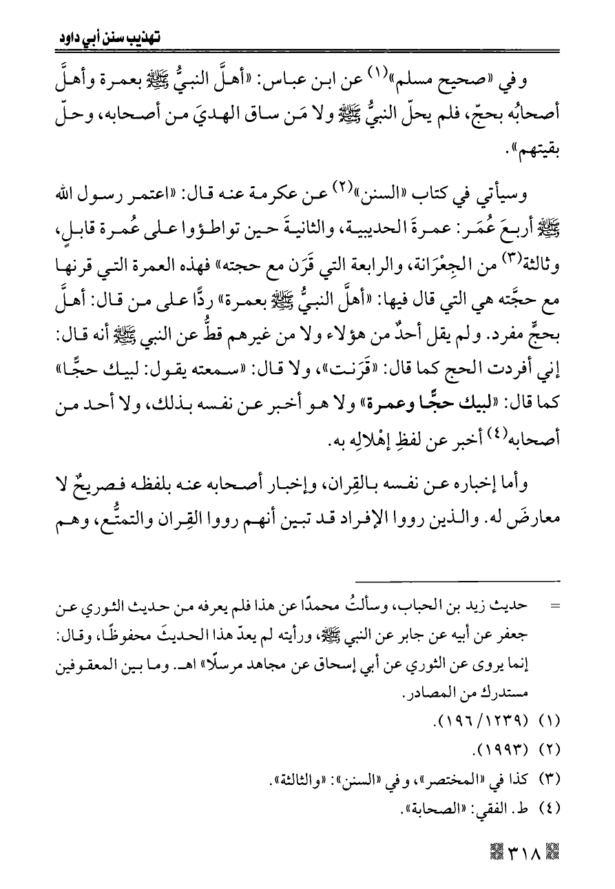 وسيأتي في كتاب «السنن» (¬٢) عن عكرمة عنه قال: «اعتمر رسول الله - صلى الله عليه وسلم - أربعَ عُمَر: عمرةَ الحديبية, والثانيةَ حين تواطؤوا على عُمرة قابلٍ, وثالثة (¬٣) من الجِعْرَانة, والرابعة التي قَرَن مع حجته» فهذه العمرة التي قرنها مع حجَّته هي التي قال فيها: «أهلَّ النبيُّ - صلى الله عليه وسلم - بعمرة» ردًّا على من قال: أهلَّ بحجٍّ مفرد. ولم يقل أحدٌ من هؤلاء ولا من غيرهم قطُّ عن النبي - صلى الله عليه وسلم - أنه قال: إني أفردت الحج كما قال: «قَرَنت»، ولا قال: «سمعته يقول: لبيك حجًّا» كما قال: «لبيك حجًّا وعمرة» ولا هو أخبر عن نفسه بذلك, ولا أحد من أصحابه (¬٤) أخبر عن لفظِ إهْلالِه به.