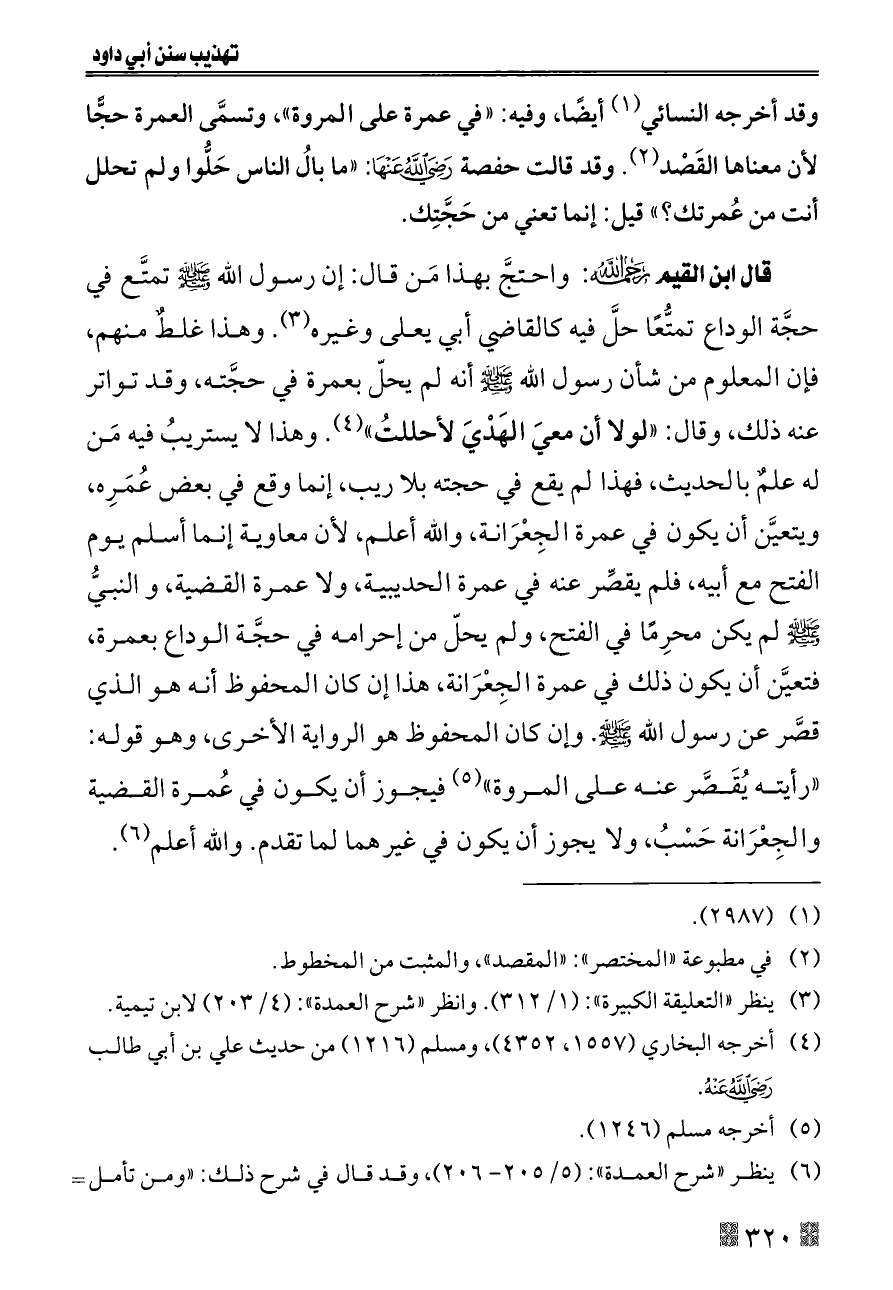 قال ابن القيم - رحمه الله -: واحتجَّ بهذا مَن قال: إن رسول الله - صلى الله عليه وسلم - تمتَّع في حجَّة الوداع تمتُّعًا حلَّ فيه كالقاضي أبي يعلى وغيره (¬٣). وهذا غلطٌ منهم, فإن المعلوم من شأن رسول الله - صلى الله عليه وسلم - أنه لم يحلّ بعمرة في حجَّته, وقد تواتر عنه ذلك، وقال: «لولا أن معيَ الهَدْيَ لأحللتُ» (¬٤). وهذا لا يستريبُ فيه مَن له علمٌ بالحديث, فهذا لم يقع في حجته بلا ريب, إنما وقع في بعض عُمَرِه, ويتعيَّن أن يكون في عمرة الجِعْرَانة, والله أعلم, لأن معاوية إنما أسلم يوم الفتح مع أبيه, فلم يقصِّر عنه في عمرة الحديبية, ولا عمرة القضية, و النبيُّ - صلى الله عليه وسلم - لم يكن محرِمًا في الفتح, ولم يحلّ من إحرامه في حجَّة الوداع بعمرة, فتعيَّن أن يكون ذلك في عمرة الجِعْرَانة, هذا إن كان المحفوظ أنه هو الذي قصَّر عن رسول الله - صلى الله عليه وسلم -. وإن كان المحفوظ هو الرواية الأخرى, وهو قوله: «رأيته يُقَصَّر عنه على المروة» (¬٥) فيجوز أن يكون في عُمرة القضية والجِعْرَانة حَسْبُ, ولا يجوز أن يكون في غيرهما لما تقدم. والله أعلم (¬٦).