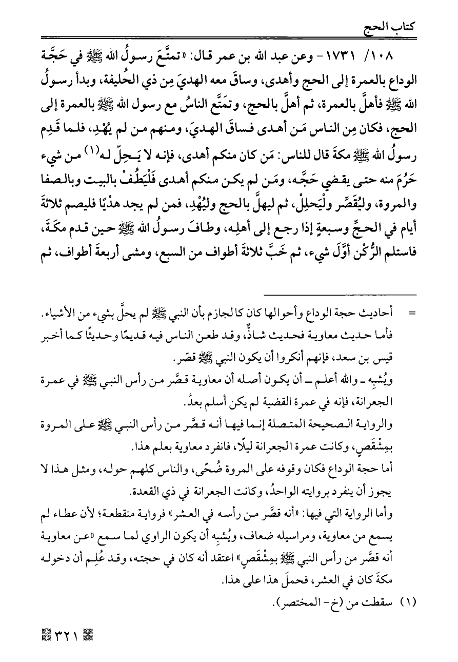 ١٠٨/ ١٧٣١ - وعن عبد الله بن عمر قال: «تمتَّعَ رسولُ الله - صلى الله عليه وسلم - في حَجَّة الوداع بالعمرة إلى الحج وأهدى، وساقَ معه الهديَ مِن ذي الحُليفة، وبدأ رسولُ الله - صلى الله عليه وسلم - فأهلَّ بالعمرة، ثم أهلَّ بالحج، وتَمتَّع الناسُ مع رسول الله - صلى الله عليه وسلم - بالعمرة إلى الحج، فكان مِن الناس مَن أهدى فساقَ الهديَ، ومنهم من لم يُهْدِ، فلما قَدِم رسولُ الله - صلى الله عليه وسلم - مكةَ قال للناس: مَن كان منكم أهدى، فإنه لا يَحِلّ له (¬١) من شيء حَرُمَ منه حتى يقضي حَجَّه، ومَن لم يكن منكم أهدى فَلْيَطُفْ بالبيت وبالصفا والمروة، وليُقَصِّر ولْيَحلِلْ، ثم ليهلَّ بالحج وليُهْدِ، فمن لم يجد هدْيًا فليصم ثلاثةَ أيام في الحجِّ وسبعةٍ إذا رجع إلى أهلِه، وطافَ رسولُ الله - صلى الله عليه وسلم - حين قدم مكَةَ، فاستلم الرُّكْن أوَّلَ شيء، ثم خَبَّ ثلاثةَ أطواف من السبع، ومشى أربعةَ أطواف، ثم
