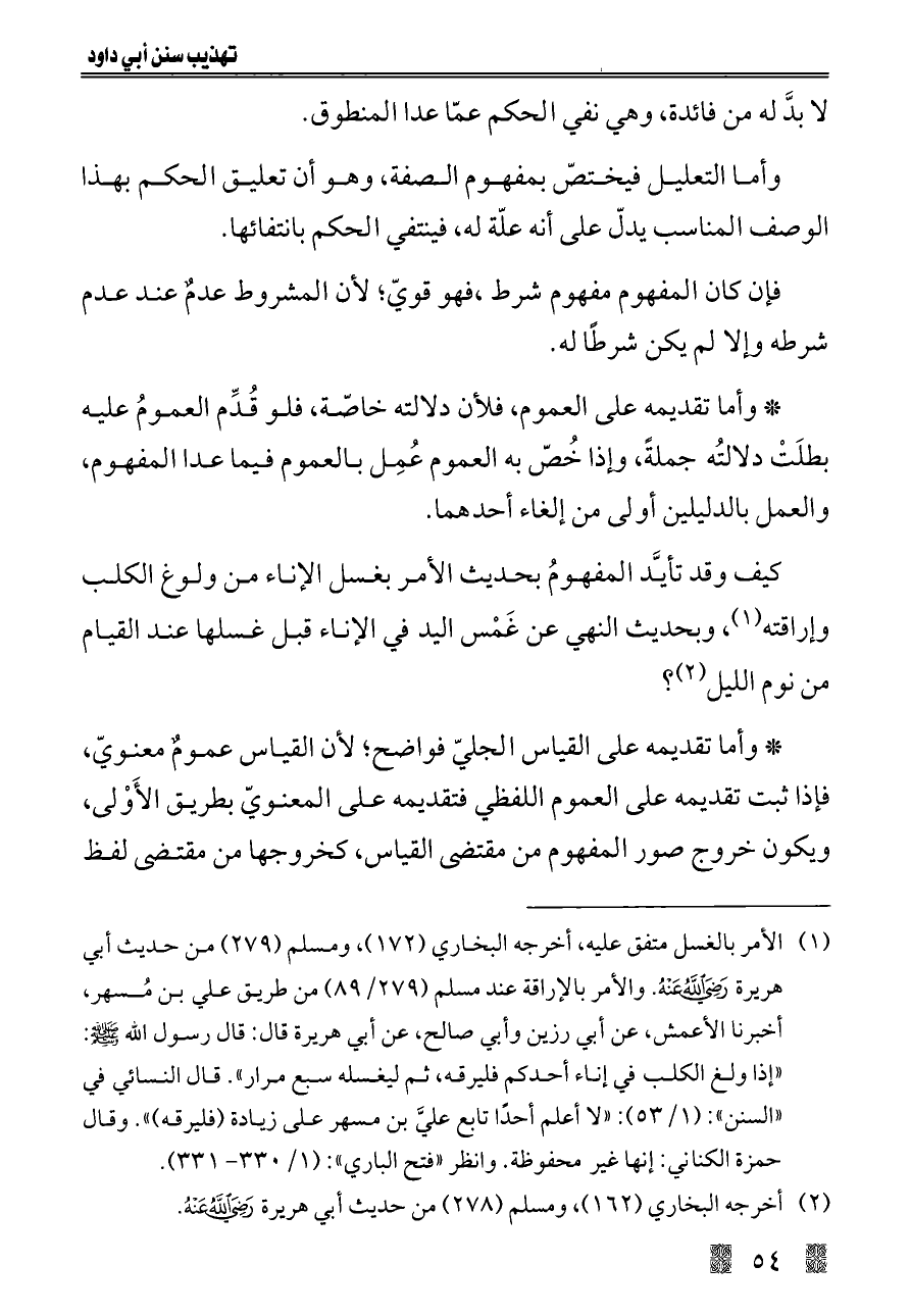 كيف وقد تأيَّد المفهومُ بحديث الأمر بغسل الإناء من ولوغ الكلب وإراقته (¬١) , وبحديث النهي عن غَمْس اليد في الإناء قبل غسلها عند القيام من نوم الليل (¬٢)؟