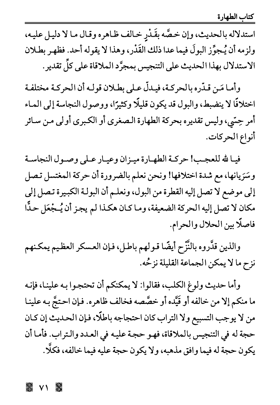فيا لله للعجب! حركة الطهارة ميزان وعيار على وصول النجاسة وسَرَيانها, مع شدة اختلافها! ونحن نعلم بالضرورة أن حركة المغتسل تصل إلى موضع لا تصل إليه القطرة من البول, ونعلم أن البولة الكبيرة تصل إلى مكان لا تصل إليه الحركة الضعيفة, وما كان هكذا لم يجز أن يُجْعَل حدًّا فاصلًا بين الحلال والحرام.