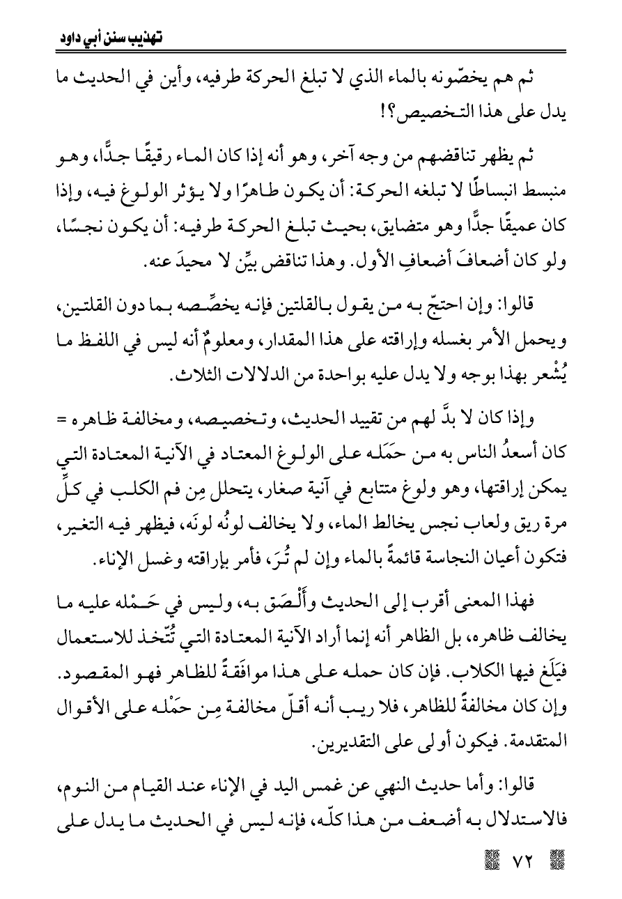 قالوا: وإن احتجّ به من يقول بالقلتين فإنه يخصِّصه بما دون القلتين, ويحمل الأمر بغسله وإراقته على هذا المقدار, ومعلومٌ أنه ليس في اللفظ ما يُشْعر بهذا بوجه ولا يدل عليه بواحدة من الدلالات الثلاث.