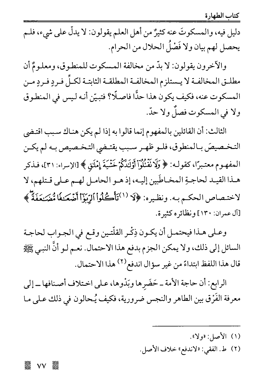 والآخرون يقولون: لا بدّ من مخالفة المسكوت للمنطوق, ومعلومٌ أن مطلق المخالفة لا يستلزم المخالفة المطلقة الثابتة لكلِّ فردٍ فردٍ من المسكوت عنه, فكيف يكون هذا حدًّا فاصلًا؟ فتبيّن أنه ليس في المنطوق ولا في المسكوت فصلٌ ولا حدّ.