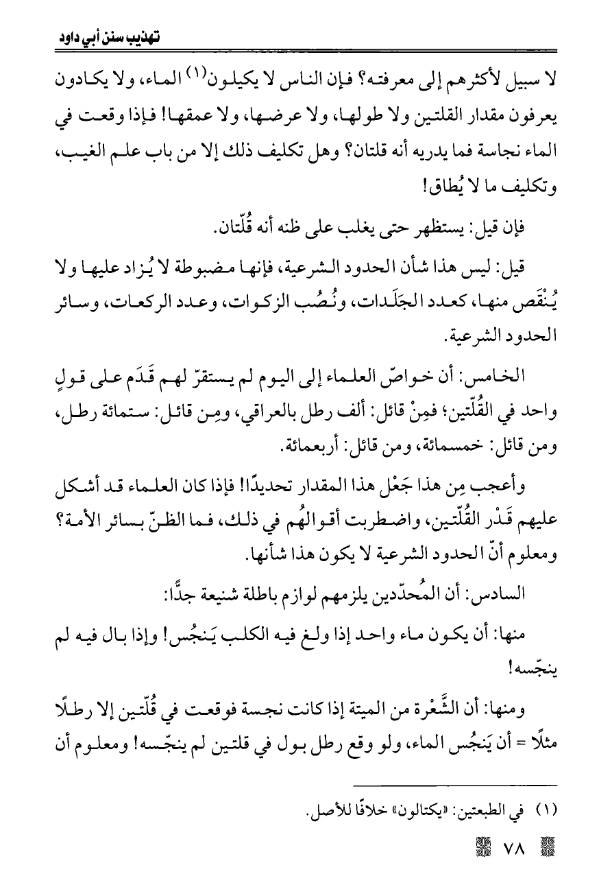 وأعجب مِن هذا جَعْل هذا المقدار تحديدًا! فإذا كان العلماء قد أشكل عليهم قَدْر القُلّتين, واضطربت أقوالُهم في ذلك, فما الظنّ بسائر الأمة؟ ومعلوم أنّ الحدود الشرعية لا يكون هذا شأنها.
