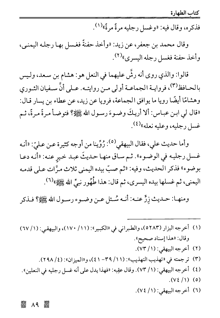 (¬٤) أخرجه البيهقي: (١/ ٧٣). وقال عقِبه: "فهذا يدل على أنه غسل رجليه في النعلين".