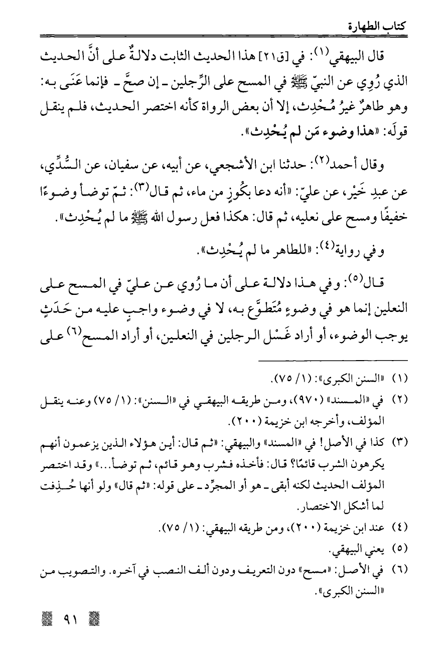 قال البيهقي (¬١): في [ق ٢١] هذا الحديث الثابت دلالةٌ على أنَّ الحديث الذي رُوِي عن النبيّ - صلى الله عليه وسلم - في المسح على الرِّجلين ــ إن صحَّ ــ فإنما عَنَى به: وهو طاهرٌ غيرُ مُحْدِث، إلا أن بعض الرواة كأنه اختصر الحديث, فلم ينقل قولَه: "هذا وضوء مَن لم يُحْدِث".