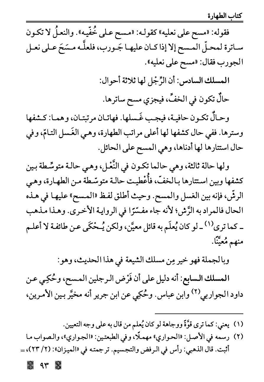 ولها حالة ثالثة, وهي حالما تكون في النَّعْل, وهي حالة متوسِّطة بين كشفها وبين استتارها بالخفّ، فأُعْطيت حالة متوسّطة من الطهارة, وهي الرشّ, فإنه بين الغسل والمسح. وحيث أطلق لفظ "المسح" عليها في هذه الحال فالمراد به الرَّش؛ لأنه جاء مفسّرًا في الرواية الأخرى. وهذا مذهب ــ كما ترى (¬١) ــ لو كان يُعلَم به قائل معيَّن، ولكن يُحْكَى عن طائفة لا أعلم منهم مُعيَّنًا.
