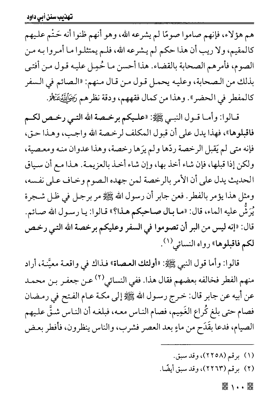 قالوا: وأما قول النبي - صلى الله عليه وسلم -: «عليكم برخصة الله التي رخص لكم فاقبلوها»، فهذا يدل على أن قبول المكلف لرخصة الله واجب، وهذا حق، فإنه متى لم يَقبل الرخصة ردّها ولم يرَها رخصة، وهذا عدوان منه ومعصية، ولكن إذا قبلها، فإن شاء أخذ بها، وإن شاء أخذ بالعزيمة. هذا مع أن سياق الحديث يدل على أن الأمر بالرخصة لمن جهده الصوم وخاف على نفسه، ومثل هذا يؤمر بالفطر. فعن جابر أن رسول الله - صلى الله عليه وسلم - مر برجل في ظل شجرة يُرَشُّ عليه الماء، قال: «ما بال صاحبكم هذا؟» قالوا: يا رسول الله صائم. قال: «إنه ليس من البر أن تصوموا في السفر وعليكم برخصة الله التي رخص لكم فاقبلوها» رواه النسائي (¬١).