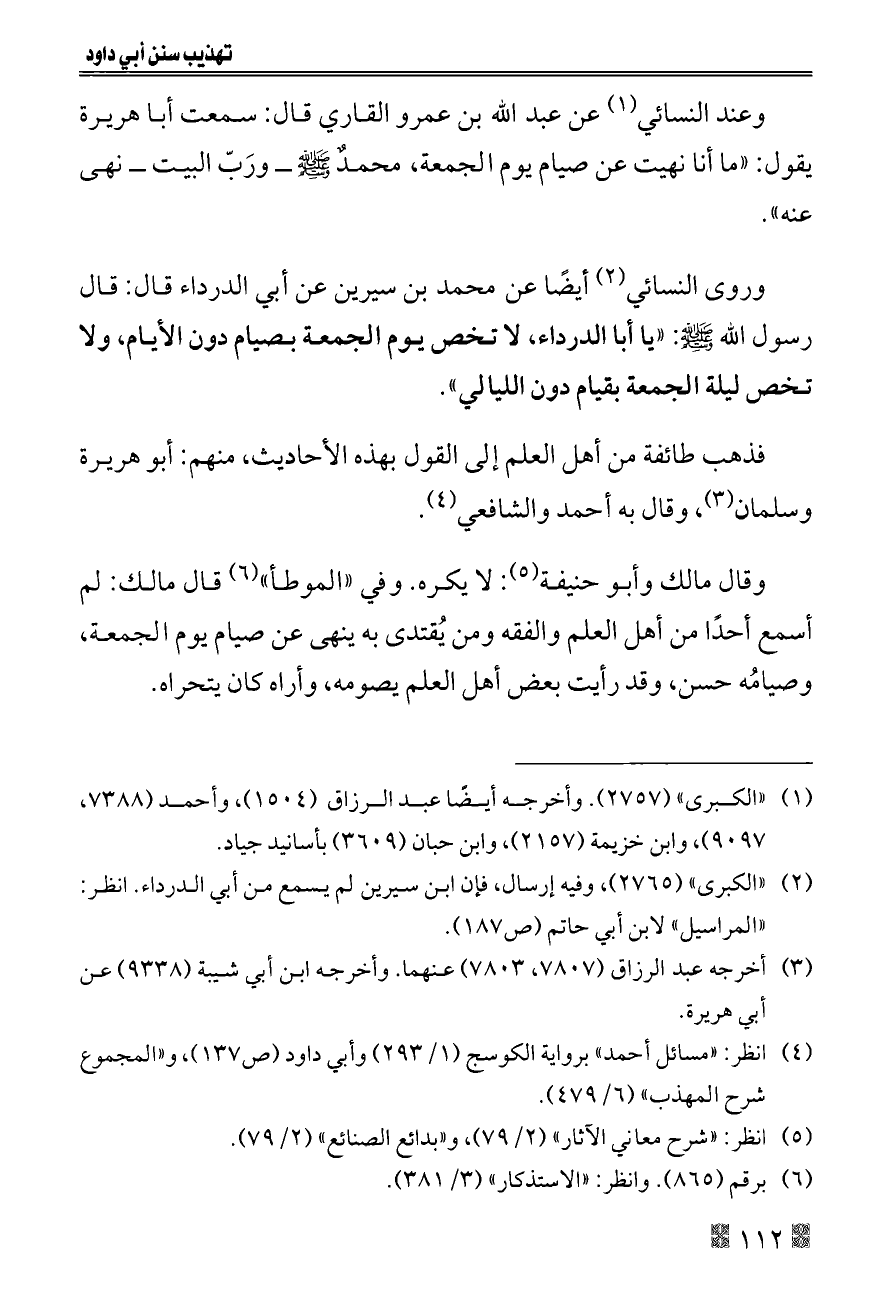 وروى النسائي (¬٢) أيضًا عن محمد بن سيرين عن أبي الدرداء قال: قال رسول الله - صلى الله عليه وسلم -: «يا أبا الدرداء، لا تخص يوم الجمعة بصيام دون الأيام، ولا تخص ليلة الجمعة بقيام دون الليالي».