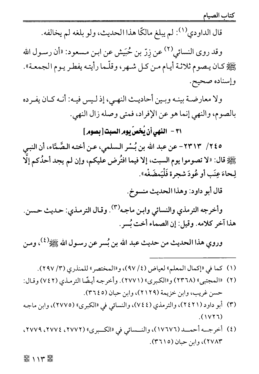 ٢٤٥/ ٢٣١٣ - عن عبد الله بن بُسْر السلمي، عن أخته الصَّمَّاء، أن النبي - صلى الله عليه وسلم - قال: «لا تصوموا يوم السبت، إلا فيما افتُرض عليكم، وإن لم يجد أحدُكم إلَّا لِحاءَ عِنَب أو عُودَ شجرة فَلْيَمضَغْه».