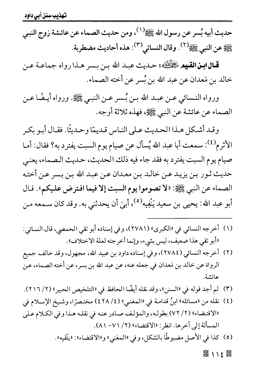 قال ابن القيم - رحمه الله -: حديث عبد الله بن بسر هذا رواه جماعة عن خالد بن مَعدان عن عبد الله بن بُسر عن أخته الصماء.