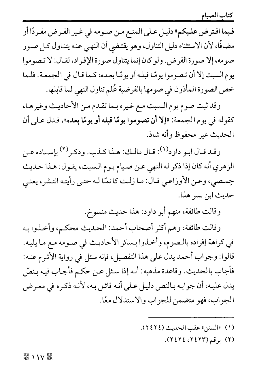 فيما افترض عليكم» دليل على المنع من صومه في غير الفرض مفردًا أو مضافًا، لأن الاستثناء دليل التناول، وهو يقتضي أن النهي عنه يتناول كل صور صومه، إلا صورة الفرض. ولو كان إنما يتناول صورة الإفراد، لقال: لا تصوموا يوم السبت إلا أن تصوموا يومًا قبله أو يومًا بعده، كما قال في الجمعة. فلما خص الصورة المأذون في صومها بالفرضية عُلم تناول النهي لما قابلها.