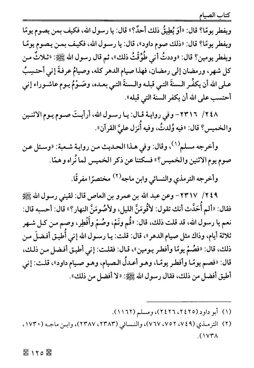 ٢٤٩/ ٢٣١٧ - وعن عبد الله بن عمرو بن العاص قال: لقيني رسول الله - صلى الله عليه وسلم - فقال: «ألم أُحَدَّث أنك تقول: لأقُومَنَّ الليل، ولأصُومَنَّ النهار؟» قال: أحسبه قال: نعم يا رسول الله، قد قلت ذلك، قال: «قُم ونَمْ، وصُمْ وأَفْطِر، وصم من كل شهر ثلاثة أيام، وذاك مثل صيام الدهر»، قال: قلت: يا رسول الله إني أُطيق أفضلَ من ذلك، قال: «فصُمْ يومًا وأفطر يومين»، قال: فقلت: إني أطيق أفضل من ذلك، قال: «فصم يومًا وأفطر يومًا، وهو أعدلُ الصيام، وهو صيام داود»، قلت: إني أطيق أفضل من ذلك، فقال رسول الله - صلى الله عليه وسلم -: «لا أفضل من ذلك».