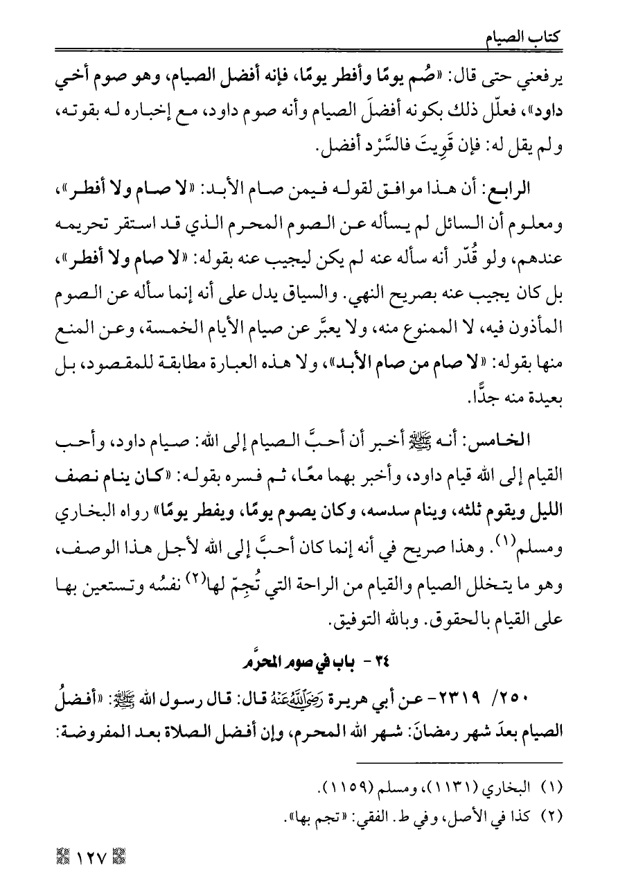 الخامس: أنه - صلى الله عليه وسلم - أخبر أن أحبَّ الصيام إلى الله: صيام داود، وأحب القيام إلى الله قيام داود، وأخبر بهما معًا، ثم فسره بقوله: «كان ينام نصف الليل ويقوم ثلثه، وينام سدسه، وكان يصوم يومًا، ويفطر يومًا» رواه البخاري ومسلم (¬١). وهذا صريح في أنه إنما كان أحبَّ إلى الله لأجل هذا الوصف، وهو ما يتخلل الصيام والقيام من الراحة التي تُجِمّ لها (¬٢) نفسُه وتستعين بها على القيام بالحقوق. وبالله التوفيق.