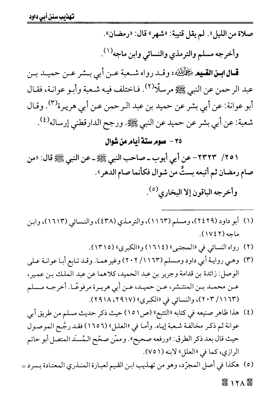قال ابن القيم - رحمه الله -: وقد رواه شعبة عن أبي بشر عن حميد بن عبد الرحمن عن النبي - صلى الله عليه وسلم - مرسلًا (¬٢). فاختلف فيه شعبة وأبو عوانة، فقال أبو عوانة: عن أبي بشر عن حميد بن عبد الرحمن عن أبي هريرة (¬٣). وقال شعبة: عن أبي بشر عن حميد عن النبي - صلى الله عليه وسلم -. ورجح الدارقطني إرساله (¬٤).
