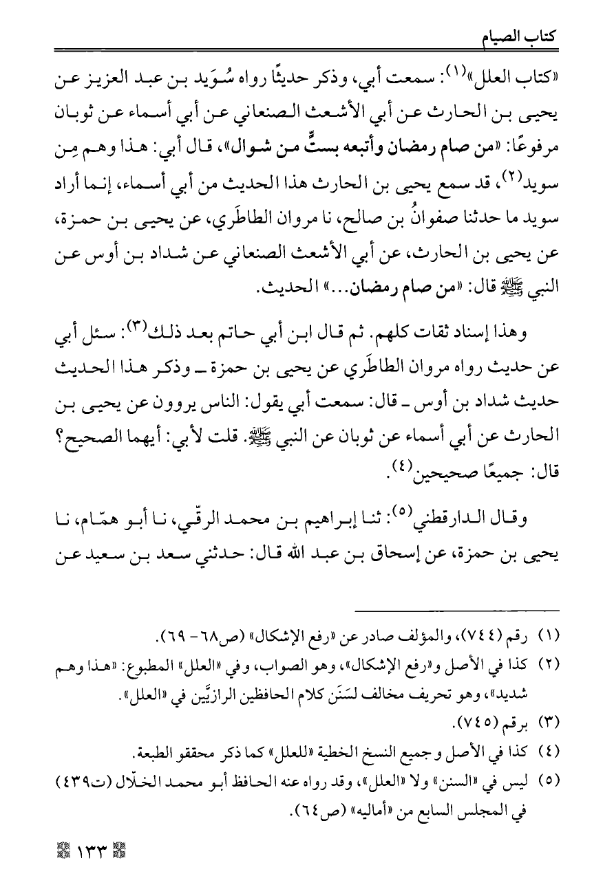 «كتاب العلل» (¬١): سمعت أبي، وذكر حديثًا رواه سُوَيد بن عبد العزيز عن يحيى بن الحارث عن أبي الأشعث الصنعاني عن أبي أسماء عن ثوبان مرفوعًا: «من صام رمضان وأتبعه بستٍّ من شوال»، قال أبي: هذا وهم مِن سويد (¬٢)، قد سمع يحيى بن الحارث هذا الحديث من أبي أسماء، إنما أراد سويد ما حدثنا صفوانُ بن صالح، نا مروان الطاطَري، عن يحيى بن حمزة، عن يحيى بن الحارث، عن أبي الأشعث الصنعاني عن شداد بن أوس عن النبي - صلى الله عليه وسلم - قال: «من صام رمضان ... » الحديث.