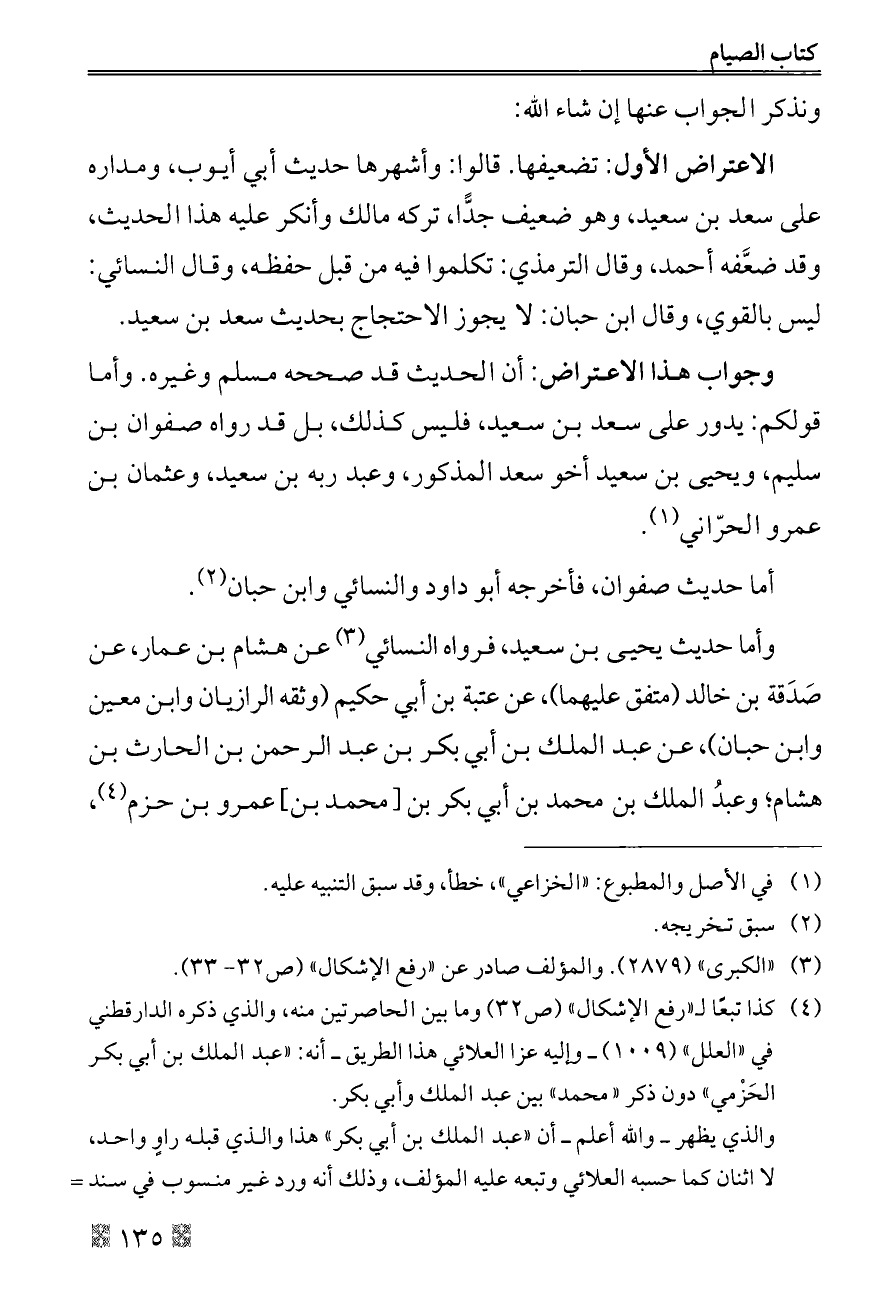 وجواب هذا الاعتراض: أن الحديث قد صححه مسلم وغيره. وأما قولكم: يدور على سعد بن سعيد، فليس كذلك، بل قد رواه صفوان بن سليم، ويحيى بن سعيد أخو سعد المذكور، وعبد ربه بن سعيد، وعثمان بن عمرو الحرّاني (¬١).