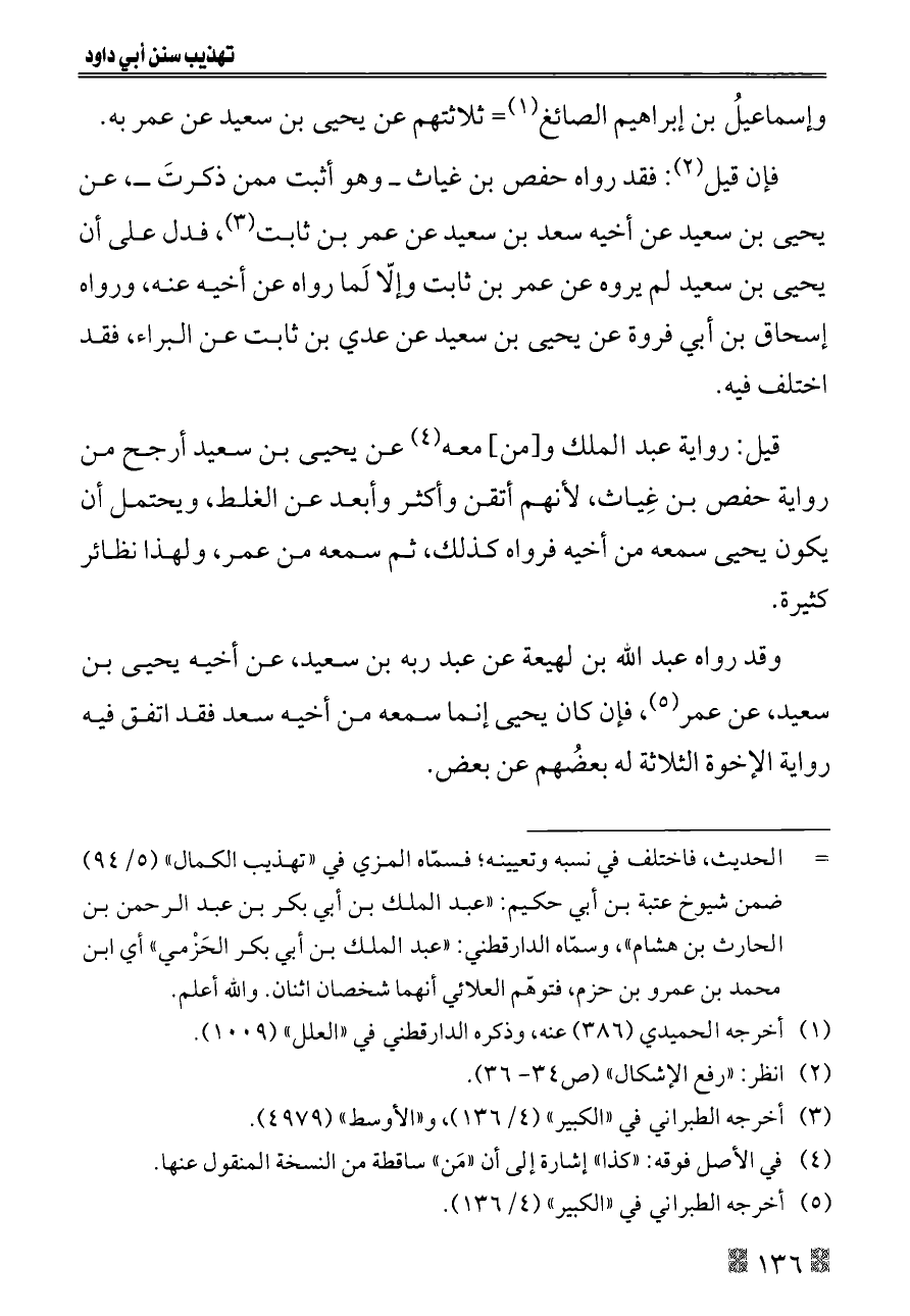 وقد رواه عبد الله بن لهيعة عن عبد ربه بن سعيد، عن أخيه يحيى بن سعيد، عن عمر (¬٥)، فإن كان يحيى إنما سمعه من أخيه سعد فقد اتفق فيه رواية الإخوة الثلاثة له بعضُهم عن بعض.