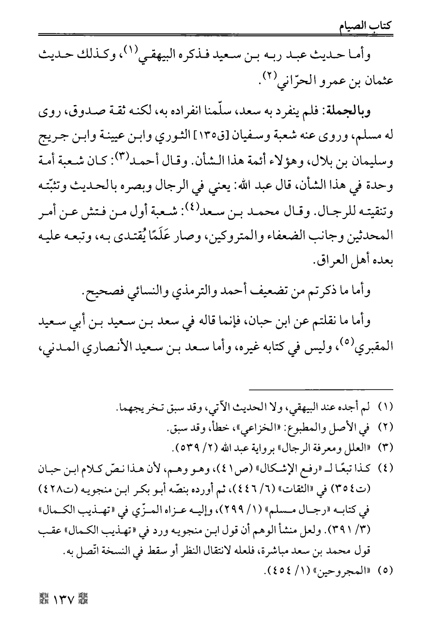 وبالجملة: فلم ينفرد به سعد، سلّمنا انفراده به، لكنه ثقة صدوق، روى له مسلم، وروى عنه شعبة وسفيان [ق ١٣٥] الثوري وابن عيينة وابن جريج وسليمان بن بلال، وهؤلاء أئمة هذا الشأن. وقال أحمد (¬٣): كان شعبة أمة وحدة في هذا الشأن، قال عبد الله: يعني في الرجال وبصره بالحديث وتثبّته وتنقيته للرجال. وقال محمد بن سعد (¬٤): شعبة أول من فتش عن أمر المحدثين وجانب الضعفاء والمتروكين، وصار عَلَمًا يُقتدى به، وتبعه عليه بعده أهل العراق.