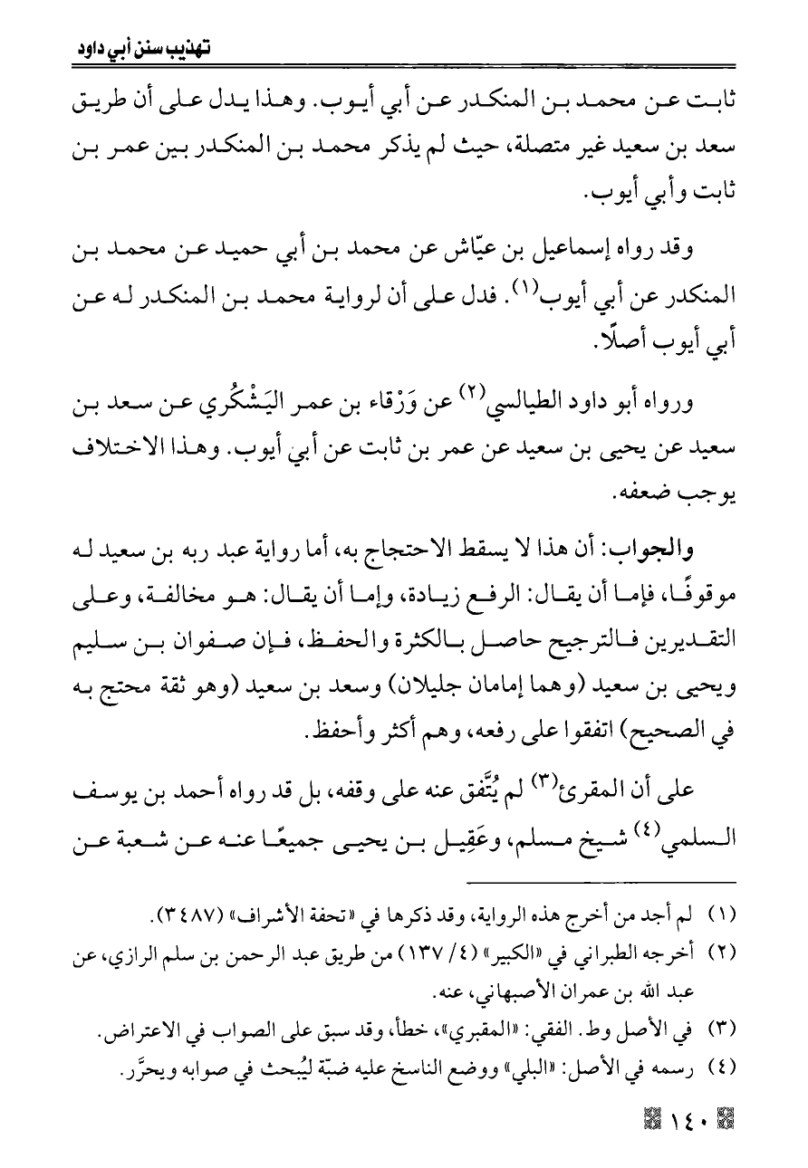 ثابت عن محمد بن المنكدر عن أبي أيوب. وهذا يدل على أن طريق سعد بن سعيد غير متصلة، حيث لم يذكر محمد بن المنكدر بين عمر بن ثابت وأبي أيوب.