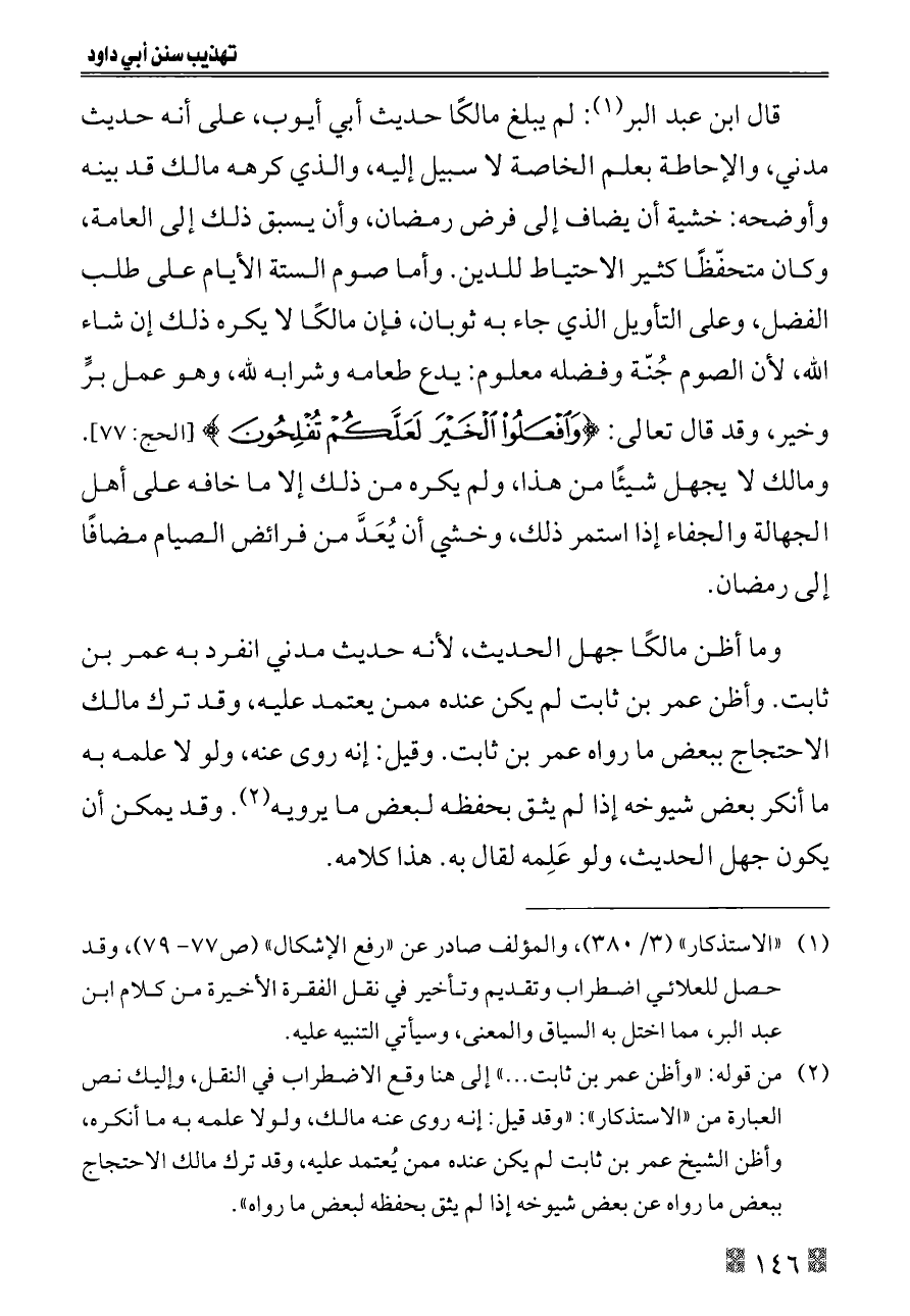 (¬٢). من قوله: «وأظن عمر بن ثابت ... » إلى هنا وقع الاضطراب في النقل، وإليك نص العبارة من «الاستذكار»: «وقد قيل: إنه روى عنه مالك، ولولا علمه به ما أنكره، وأظن الشيخ عمر بن ثابت لم يكن عنده ممن يُعتمد عليه، وقد ترك مالك الاحتجاج ببعض ما رواه عن بعض شيوخه إذا لم يثق بحفظه لبعض ما رواه».
