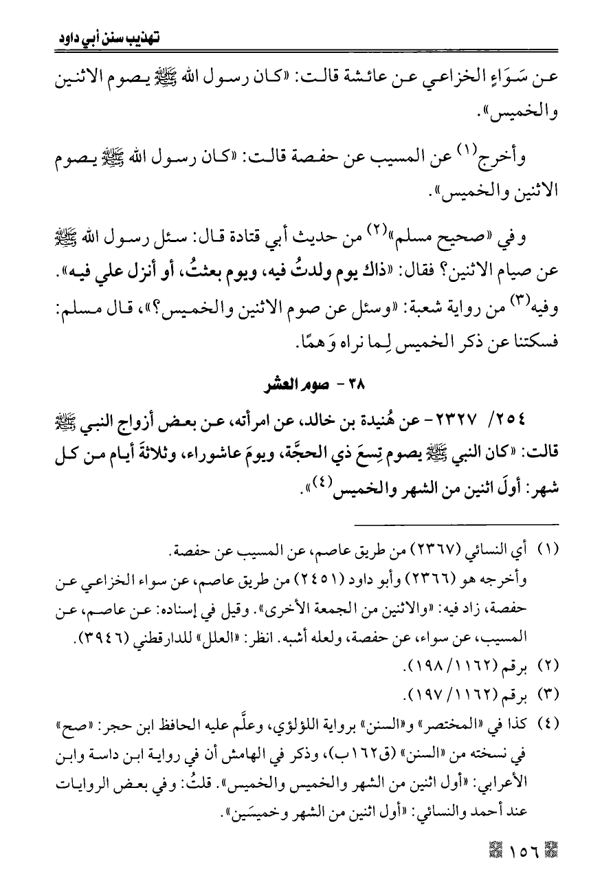 (¬٤). كذا في «المختصر» و «السنن» برواية اللؤلؤي، وعلَّم عليه الحافظ ابن حجر: «صح» في نسخته من «السنن» (ق ١٦٢ ب)، وذكر في الهامش أن في رواية ابن داسة وابن الأعرابي: «أول اثنين من الشهر والخميس والخميس». قلتُ: وفي بعض الروايات عند أحمد والنسائي: «أول اثنين من الشهر وخميسَين».