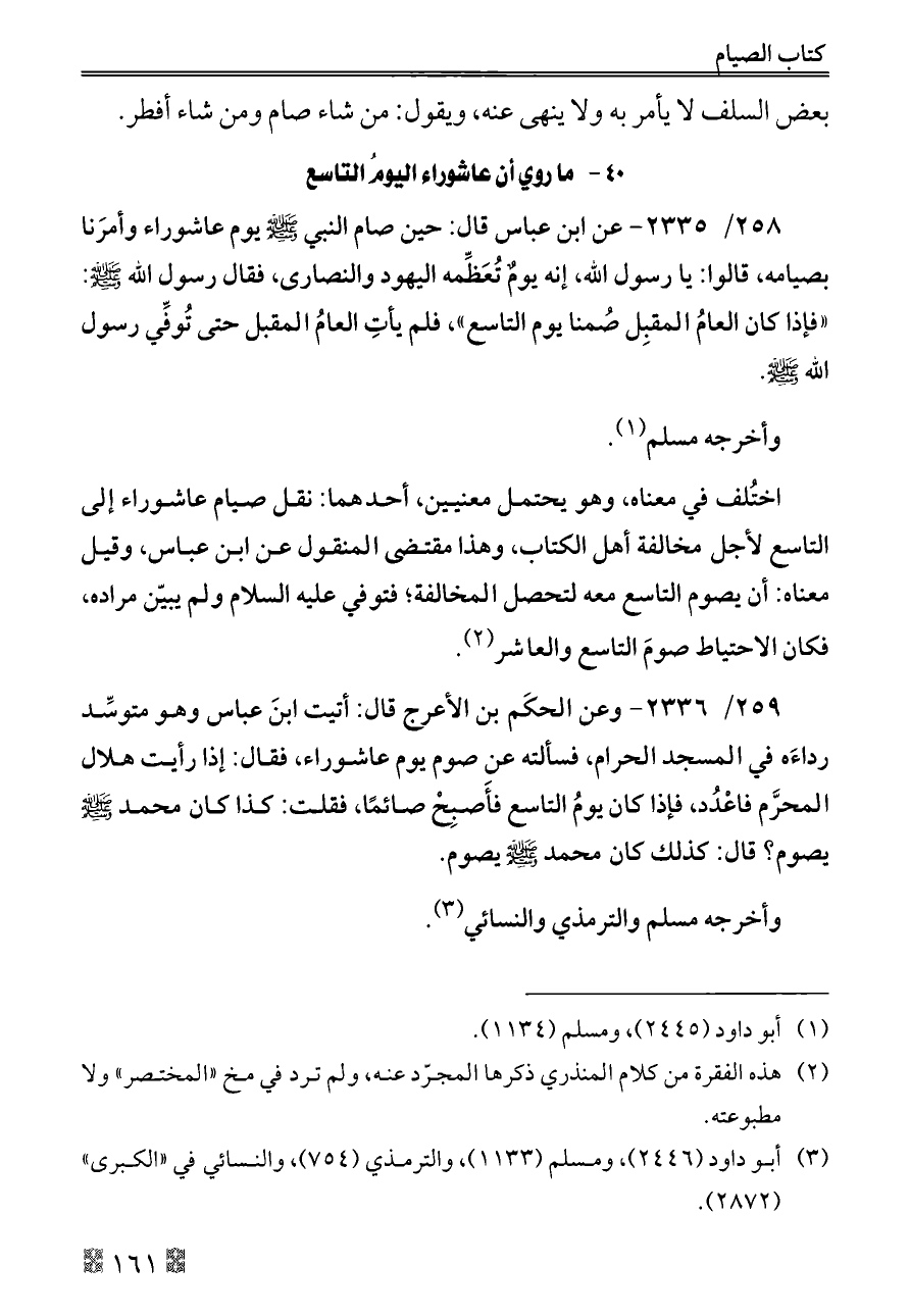 ٢٥٨/ ٢٣٣٥ - عن ابن عباس قال: حين صام النبي - صلى الله عليه وسلم - يوم عاشوراء وأمرَنا بصيامه، قالوا: يا رسول الله، إنه يومٌ تُعَظِّمه اليهود والنصارى، فقال رسول الله - صلى الله عليه وسلم -: «فإذا كان العامُ المقبِل صُمنا يوم التاسع»، فلم يأتِ العامُ المقبل حتى تُوفِّي رسول الله - صلى الله عليه وسلم -.