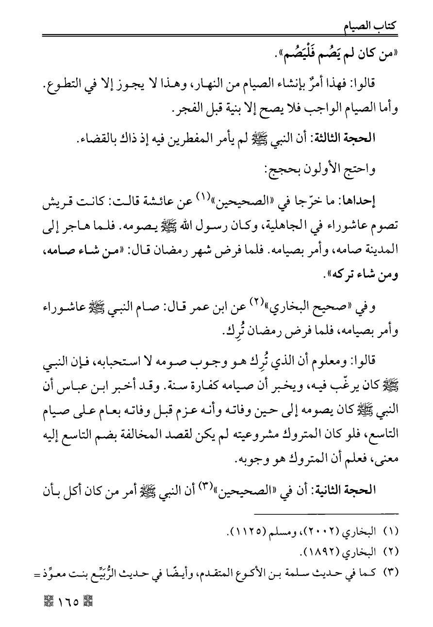 قالوا: فهذا أمرٌ بإنشاء الصيام من النهار، وهذا لا يجوز إلا في التطوع. وأما الصيام الواجب فلا يصح إلا بنية قبل الفجر.