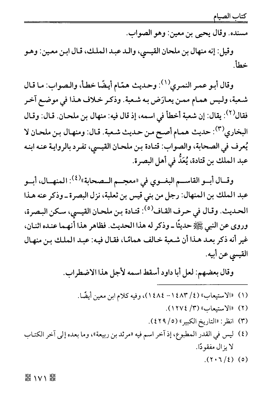 وقال أبو القاسم البغوي في «معجم الصحابة» (¬٤): المنهال، أبو عبد الملك بن المنهال: رجل من بني قيس بن ثعلبة، نزل البصرة ــ وذكر عنه هذا الحديث. وقال في حرف القاف (¬٥): قتادة بن ملحان القيسي، سكن البصرة، وروى عن النبي - صلى الله عليه وسلم - حديثًا ــ وذكر له هذا الحديث. فظاهر هذا أنهما عنده اثنان، غير أنه ذكر بعد هذا أن شعبة خالف همامًا، فقال فيه: عبد الملك بن منهال القيسي عن أبيه.
