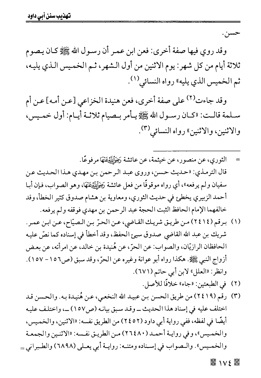 (¬٣). رقم (٢٤١٩) من طريق الحسن بن عبيد الله النخعي، عن هُنيدة به. والحسن قد اختلف عليه في إسناد هذا الحديث ــ وقد سبق بيانه (ص ١٥٧) ــ، واختلف عليه أيضًا في لفظه، ففي رواية أبي داود (٢٤٥٢) من الطريق نفسه: «الاثنين، والخميس، والخميس»، وفي رواية أحمد (٢٦٤٨٠) من الطريق نفسه: «الاثنين والجمعة والخميس». والصواب في إسناده ومتنه: رواية أبي يعلى (٦٨٩٨) والطبراني (٢٣/ ٤٢١) من طريق الحسن، عن الحرّ بن الصيّاح، عن هنيدة، عن امرأته، عن أم سلمة بلفظ: «الاثنين، والخميس، والخميس الذي يليه».