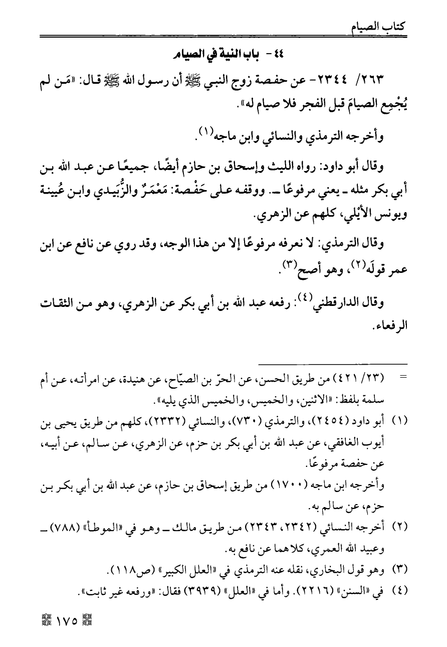 ٢٦٣/ ٢٣٤٤ - عن حفصة زوج النبي - صلى الله عليه وسلم - أن رسول الله - صلى الله عليه وسلم - قال: «مَن لم يُجْمِع الصيامَ قبل الفجر فلا صيام له».