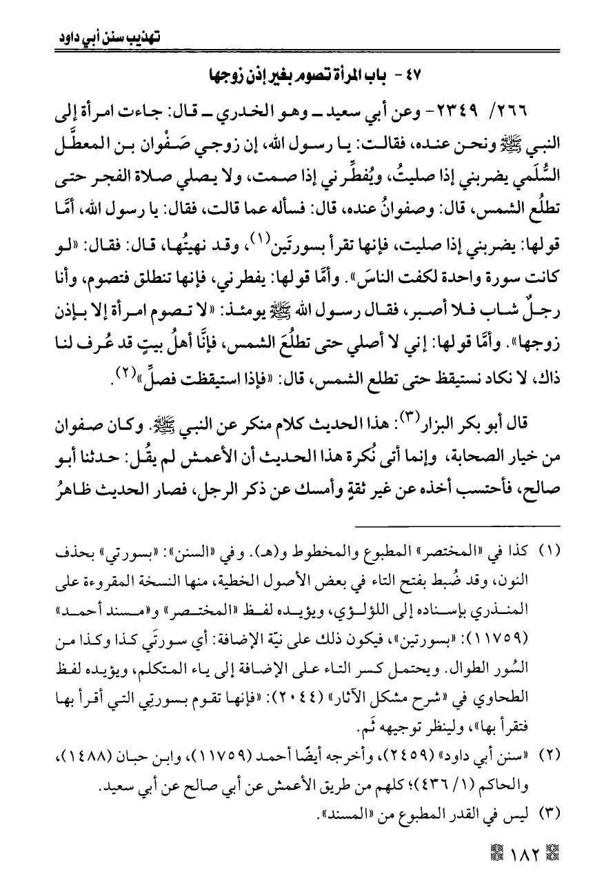 ٢٦٦/ ٢٣٤٩ - وعن أبي سعيد ــ وهو الخدري ــ قال: جاءت امرأة إلى النبي - صلى الله عليه وسلم - ونحن عنده، فقالت: يا رسول الله، إن زوجي صَفْوان بن المعطَّل السُّلَمي يضربني إذا صليتُ، ويُفطِّرني إذا صمت، ولا يصلي صلاة الفجر حتى تطلُع الشمس، قال: وصفوانُ عنده، قال: فسأله عما قالت، فقال: يا رسول الله، أمَّا قولها: يضربني إذا صليت، فإنها تقرأ بسورتَين (¬١)، وقد نهيتُها، قال: فقال: «لو كانت سورة واحدة لكفت الناسَ». وأمَّا قولها: يفطرني، فإنها تنطلق فتصوم، وأنا رجلٌ شاب فلا أصبر، فقال رسول الله - صلى الله عليه وسلم - يومئذ: «لا تصوم امرأة إلا بإذن زوجها». وأمَّا قولها: إني لا أصلي حتى تطلُعَ الشمس، فإنَّا أهلُ بيتٍ قد عُرف لنا ذاك، لا نكاد نستيقظ حتى تطلع الشمس، قال: «فإذا استيقظت فصلِّ» (¬٢).