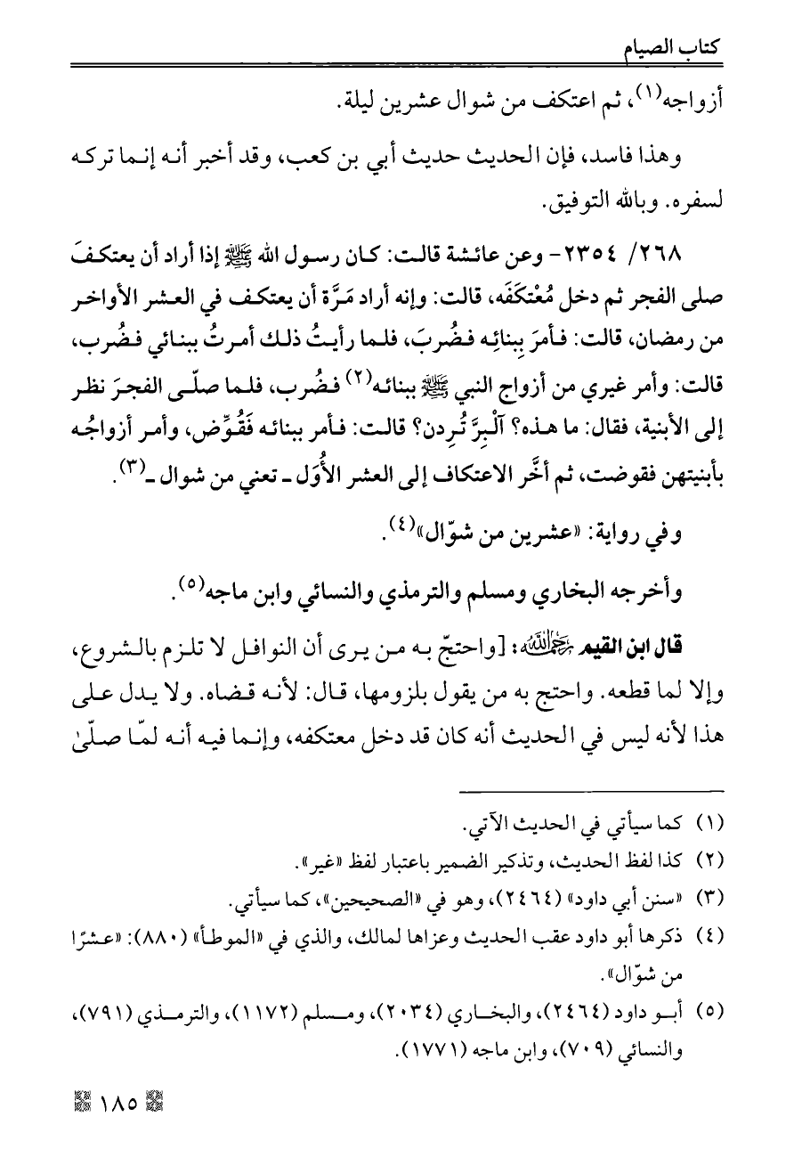 ٢٦٨/ ٢٣٥٤ - وعن عائشة قالت: كان رسول الله - صلى الله عليه وسلم - إذا أراد أن يعتكفَ صلى الفجر ثم دخل مُعْتكَفَه، قالت: وإنه أراد مَرَّة أن يعتكف في العشر الأواخر من رمضان، قالت: فأمرَ بِبنائِه فضُربَ، فلما رأيتُ ذلك أمرتُ ببنائي فضُرب، قالت: وأمر غيري من أزواج النبي - صلى الله عليه وسلم - ببنائه (¬٢) فضُرب، فلما صلّى الفجرَ نظر إلى الأبنية، فقال: ما هذه؟ آلْبِرَّ تُرِدن؟ قالت: فأمر ببنائه فَقُوِّض، وأمر أزواجُه بأبنيتهن فقوضت، ثم أخَّر الاعتكاف إلى العشر الأُوَل ــ تعني من شوال ــ (¬٣).