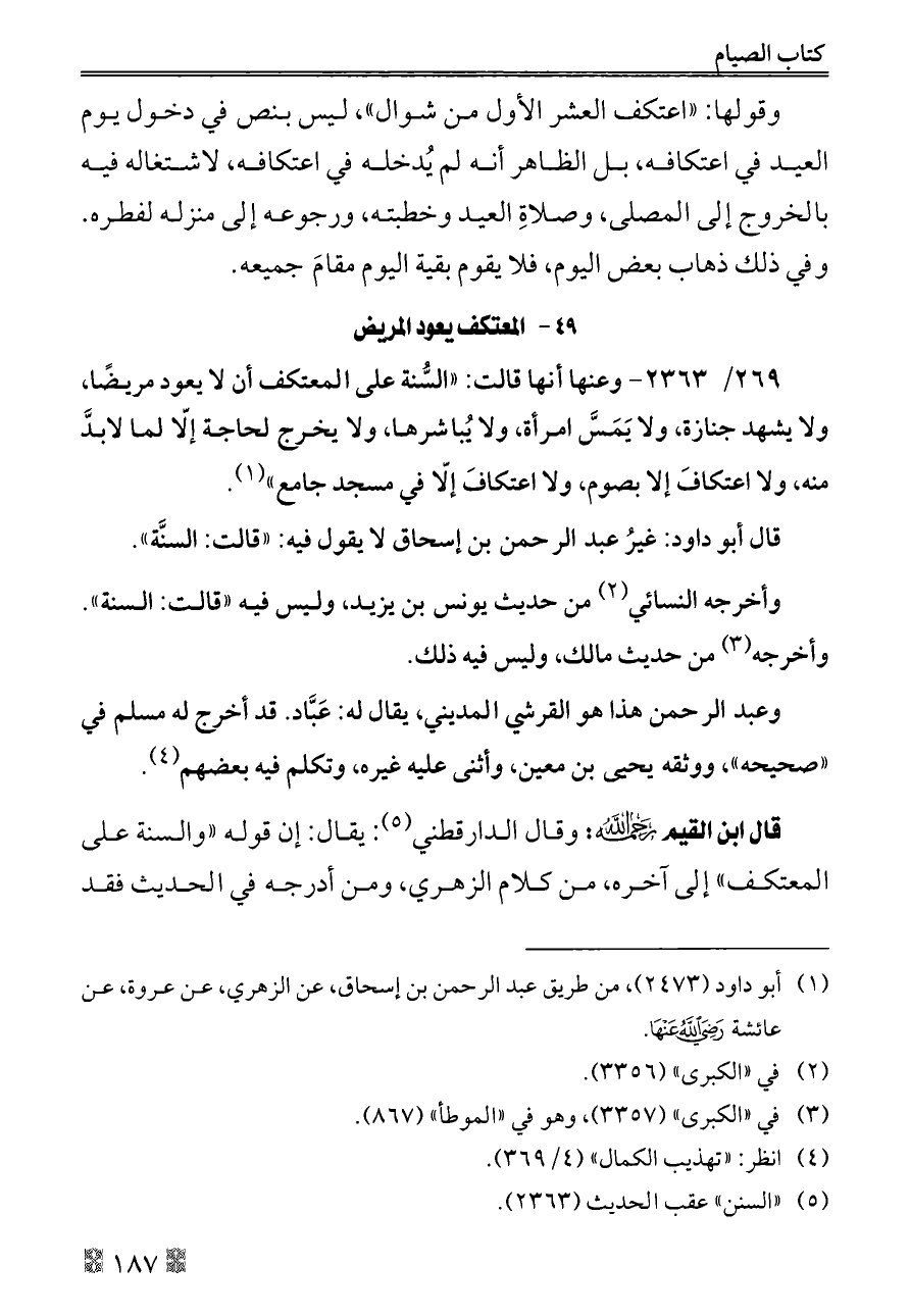 ٢٦٩/ ٢٣٦٣ - وعنها أنها قالت: «السُّنة على المعتكف أن لا يعود مريضًا، ولا يشهد جنازة، ولا يَمَسَّ امرأة، ولا يُباشرها، ولا يخرج لحاجة إلّا لما لابدَّ منه، ولا اعتكافَ إلا بصوم، ولا اعتكافَ إلّا في مسجد جامع» (¬١).