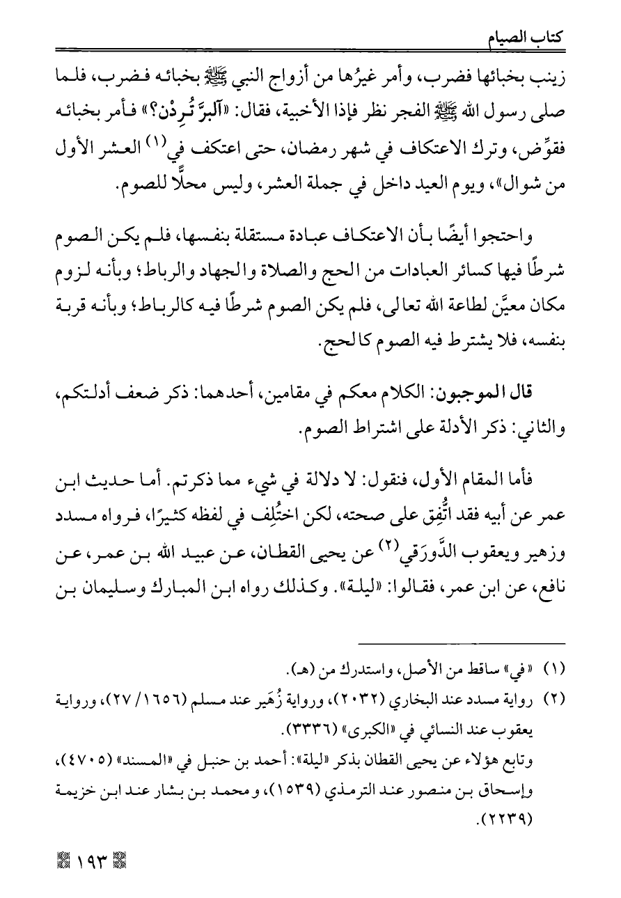 قال الموجبون: الكلام معكم في مقامين، أحدهما: ذكر ضعف أدلتكم، والثاني: ذكر الأدلة على اشتراط الصوم.