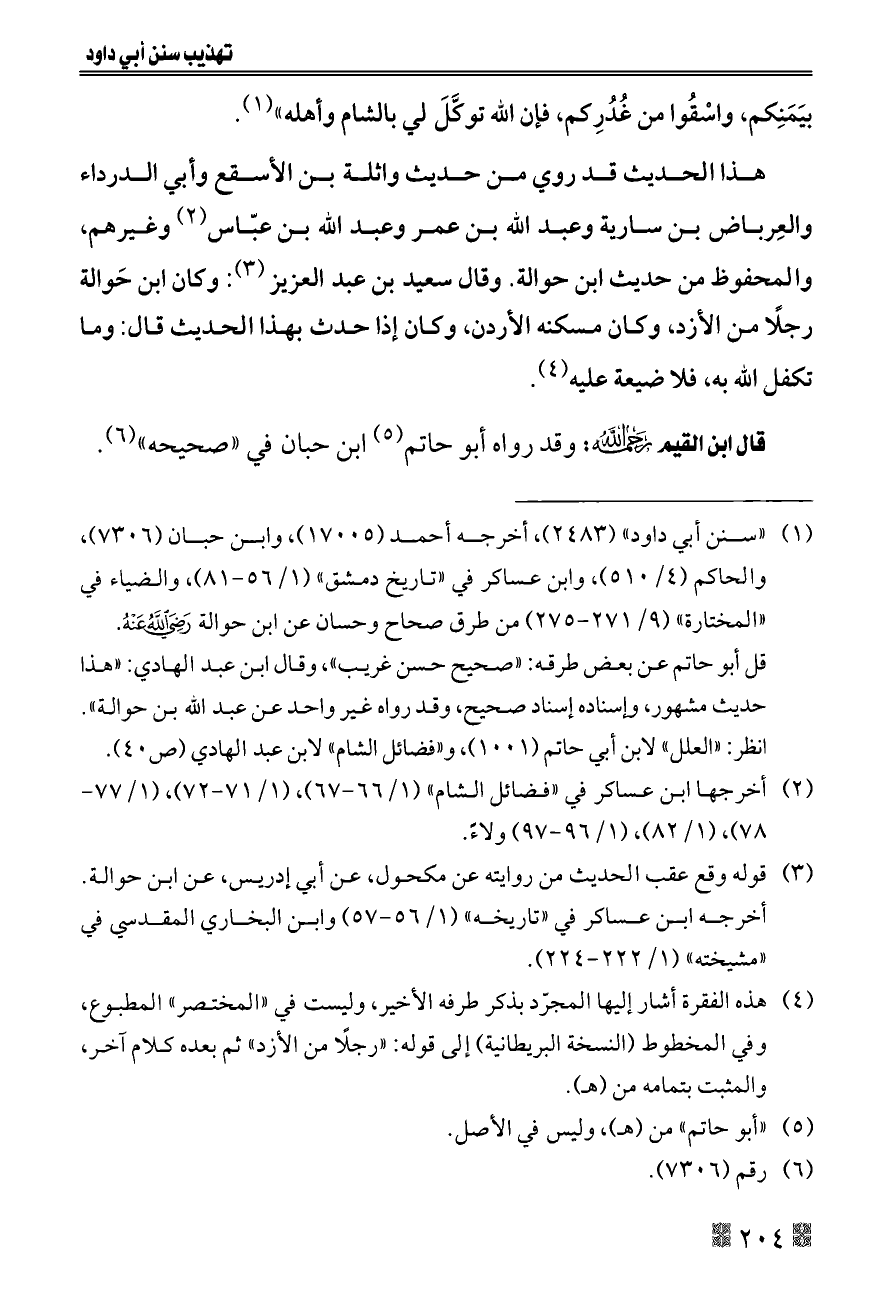 هذا الحديث قد روي من حديث واثلة بن الأسقع وأبي الدرداء والعِرباض بن سارية وعبد الله بن عمر وعبد الله بن عبّاس (¬٢) وغيرهم، والمحفوظ من حديث ابن حوالة. وقال سعيد بن عبد العزيز (¬٣): وكان ابن حَوالة رجلًا من الأزد، وكان مسكنه الأردن، وكان إذا حدث بهذا الحديث قال: وما تكفل الله به، فلا ضيعة عليه (¬٤).