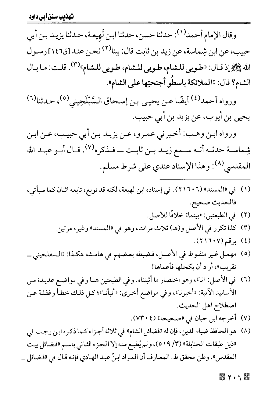 (¬٨) هو الحافظ ضياء الدين، فإن له «فضائل الشام» في ثلاثة أجزاء كما ذكره ابن رجب في «ذيل طبقات الحنابلة» (٣/ ٥١٩)، ولم يُطبع منه إلا الجزء الثاني باسم «فضائل بيت المقدس». وظن محقق ط. المعارف أن المراد ابنُ عبد الهادي فإنه قال في «فضائل الشام» (ص ٣١) له: «وإسناده على شرط الصحيح»، وهو ظن بعيد والله أعلم.