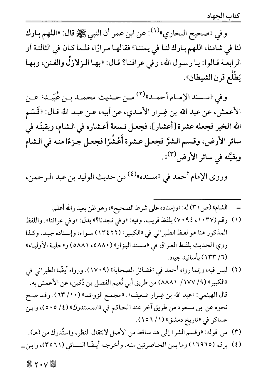 من حديث محمد بن عُبَيد، عن الأعمش، عن عبد الله بن ضِرار الأسدي، عن أبيه، عن عبد الله قال: «قَسَم الله الخير فجعله عشرة [أعشار]، فجعل تسعة أعشاره في الشام، وبقيتَه في سائر الأرض، وقسم الشرَّ فجعل عشرة أَعْشُرًا فجعل جزءًا منه في الشام وبقيَّته في سائر الأرض (¬٣)».