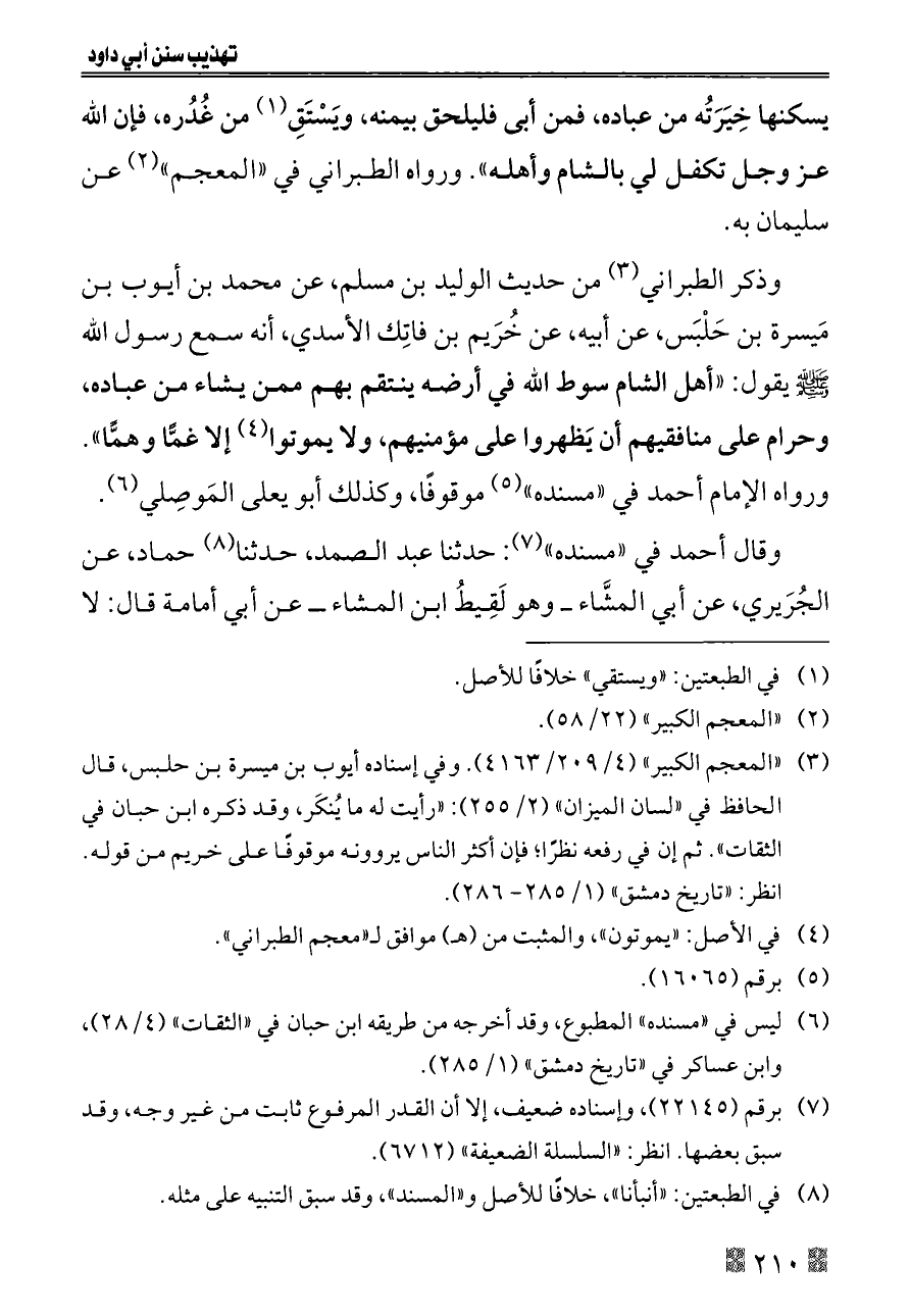 يسكنها خِيَرَتُه من عباده، فمن أبى فليلحق بيمنه، ويَسْتَقِ (¬١) من غُدُره، فإن الله عز وجل تكفل لي بالشام وأهله». ورواه الطبراني في «المعجم» (¬٢) عن سليمان به.
