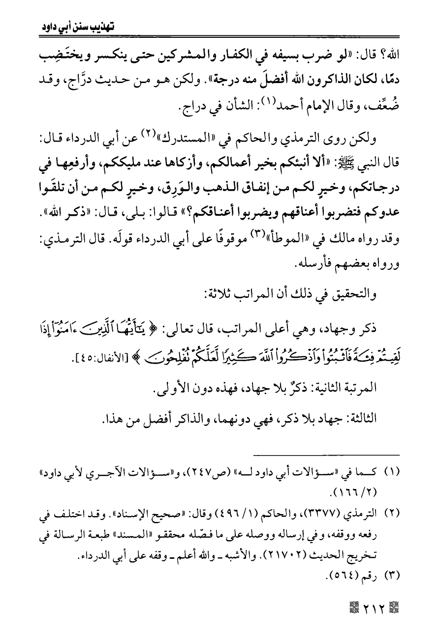 ولكن روى الترمذي والحاكم في «المستدرك» (¬٢) عن أبي الدرداء قال: قال النبي - صلى الله عليه وسلم -: «ألا أنبئكم بخير أعمالكم، وأزكاها عند مليككم، وأرفعِها في درجاتكم، وخيرٍ لكم من إنفاق الذهب والوَرِق، وخيرٍ لكم من أن تلقَوا عدوكم فتضربوا أعناقهم ويضربوا أعناقكم؟» قالوا: بلى، قال: «ذكر الله». وقد رواه مالك في «الموطأ» (¬٣) موقوفًا على أبي الدرداء قولَه. قال الترمذي: ورواه بعضهم فأرسله.