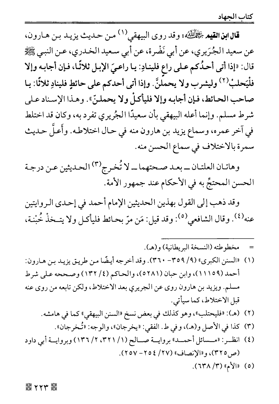 قال ابن القيم - رحمه الله -: وقد روى البيهقي (¬١) من حديث يزيد بن هارون، عن سعيد الجُرَيري، عن أبي نَضْرة، عن أبي سعيد الخدري، عن النبي - صلى الله عليه وسلم - قال: «إذا أتى أحدُكم على راعٍ فلينادِ: يا راعيَ الإبل ثلاثًا، فإن أجابه وإلا فلْيَحلبْ (¬٢) وليشرب ولا يحملنَّ. وإذا أتى أحدكم على حائطٍ فلينادِ ثلاثًا: يا صاحب الحائط، فإن أجابه وإلا فليأكلْ ولا يحملنّ». وهذا الإسناد على شرط مسلم. وإنما أعله البيهقي بأن سعيدًا الجُريري تفرد به، وكان قد اختلط في آخر عمره، وسماع يزيد بن هارون منه في حال اختلاطه. وأَعلَّ حديث سمرة بالاختلاف في سماع الحسن منه.