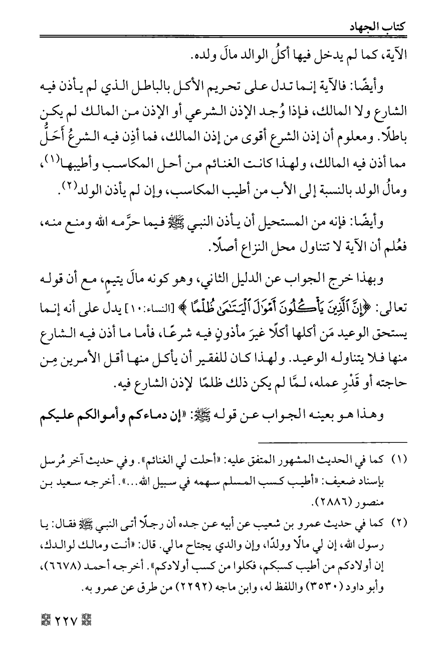 وأيضًا: فالآية إنما تدل على تحريم الأكل بالباطل الذي لم يأذن فيه الشارع ولا المالك، فإذا وُجد الإذن الشرعي أو الإذن من المالك لم يكن باطلًا. ومعلوم أن إذن الشرع أقوى من إذن المالك، فما أذِن فيه الشرعُ أَحَلُّ مما أذن فيه المالك، ولهذا كانت الغنائم من أحل المكاسب وأطيبها (¬١)، ومالُ الولد بالنسبة إلى الأب من أطيب المكاسب، وإن لم يأذن الولد (¬٢).