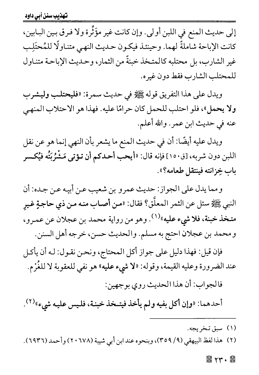إلى حديث المنع في اللبن أولى. وإن كانت غير مؤَثِّرة ولا فرق بين البابين، كانت الإباحة شاملةً لهما. وحينئذ فيكون حديث النهي متناولًا للمُحتَلِب غير الشارب، بل محتلبه كالمتخذ خبنةً من الثمار، وحديث الإباحة متناول للمحتلب الشارب فقط دون غيره.